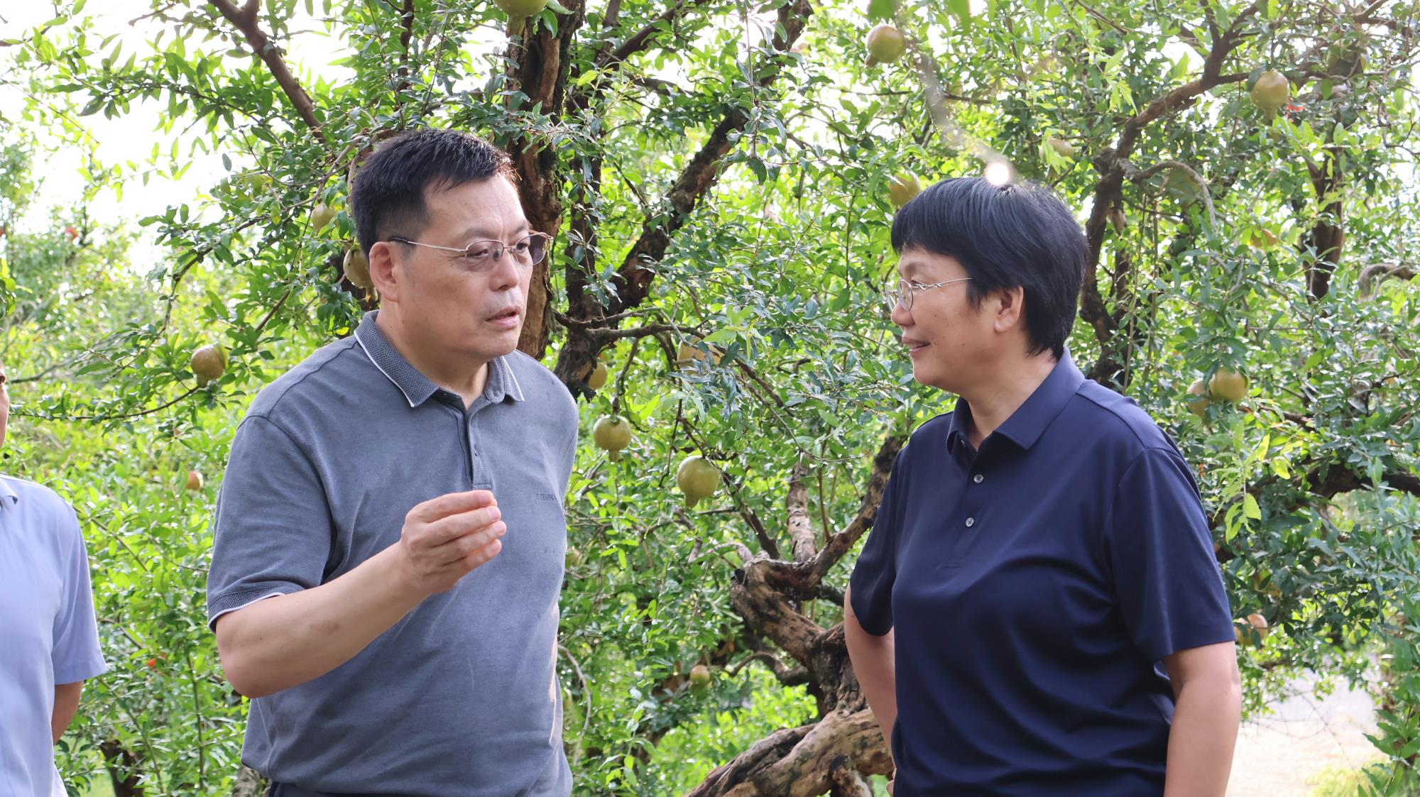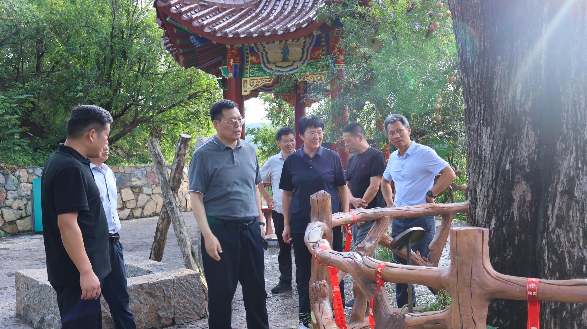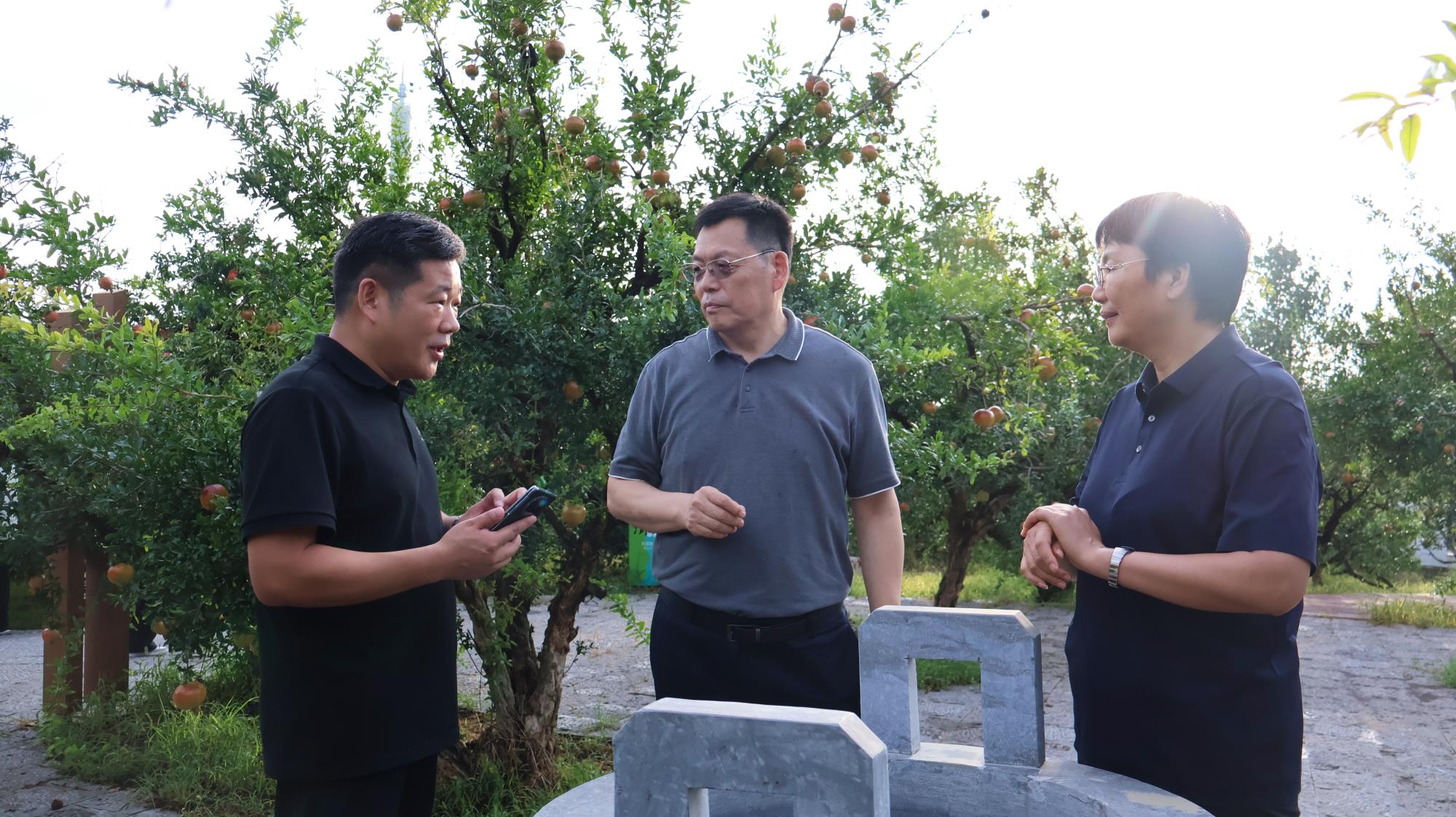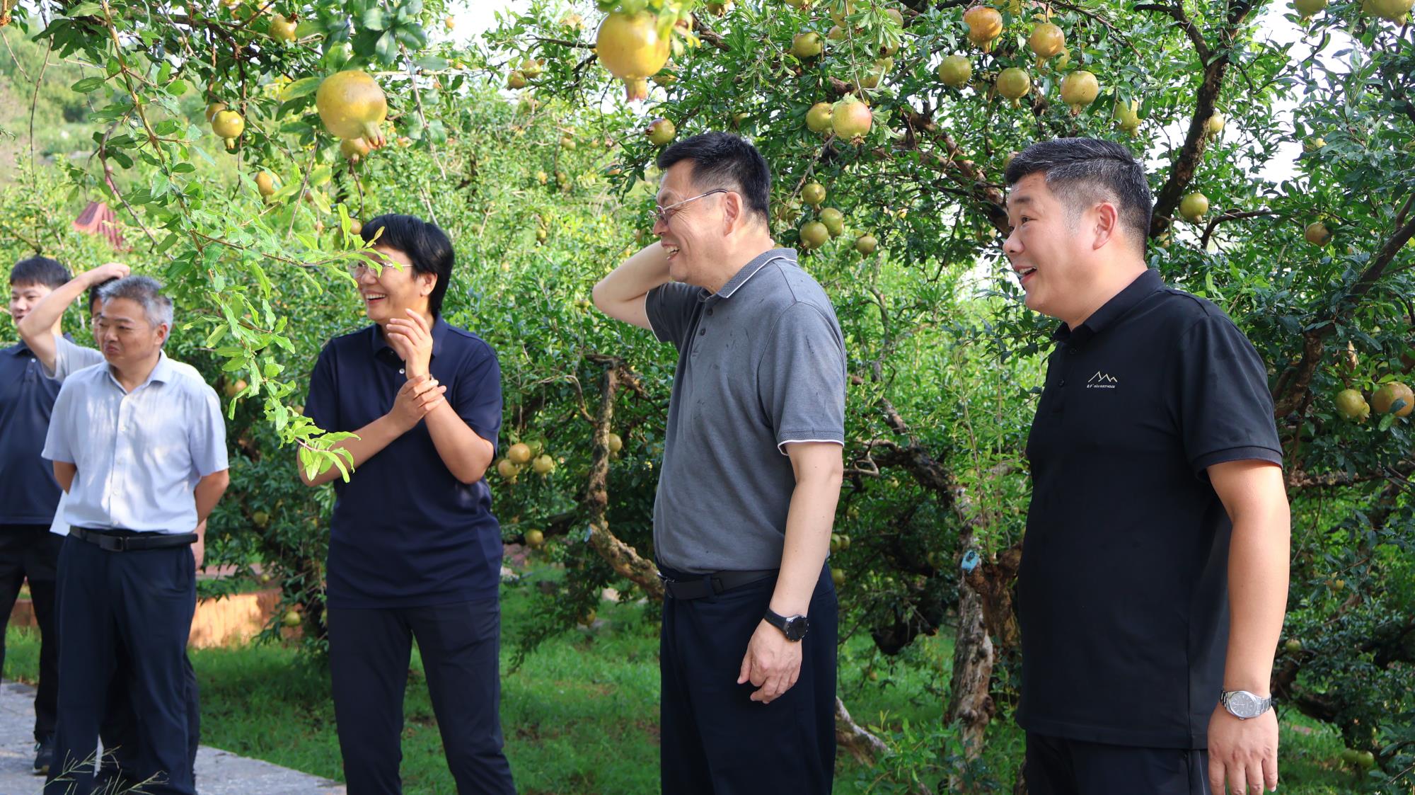 8 月 23 日下午,明清石榴园内,600 年树龄的 "镇园之宝" 枝繁叶茂,饱满的石榴果缀枝头。北京林业大学林木资源高效生产全国重点实验室主任安黎哲带领专家组一行,在淮北市副市长陈英淮北市副秘书长程荣华等陪同下,深入这片华东地区最古老的石榴园,就石榴产业发展开展专题调研。