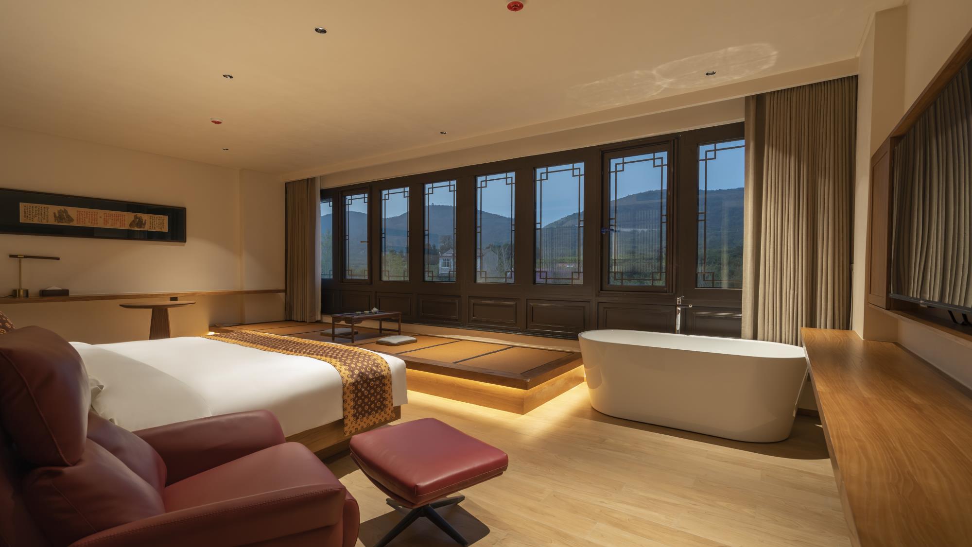 试运营期间,庐民宿就已展现出强劲吸引力,入住率高达90%。七号楼的私汤泡池正对石榴树,夜晚可听着虫鸣泡汤;二楼的270°观景阳台是拍摄榴园晚霞的最佳机位;山居套房的复合空间完美容纳亲子时光。即将开放的八号楼还将新增LOFT复式房型,9种房型覆盖从商务差旅到家庭度假的全需求。